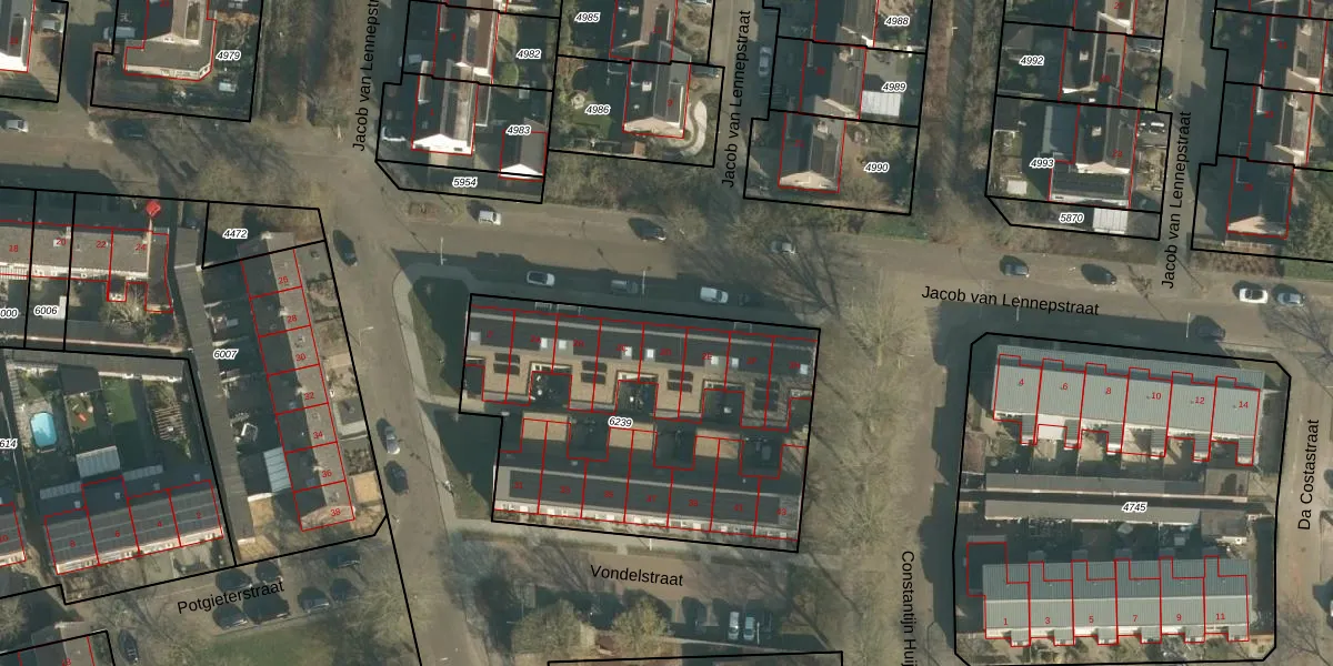 Het perceel waarop Jacob van Lennepstraat 2-D staat heeft een oppervlakte van 1663 m². Dit is een zeer groot perceel. De perceeloppervlakte wordt geregistreerd door het Kadaster. Gedetailleerde informatie over de maten van dit perceel kunt u vinden in het rapport Kadastrale kaart met maatvoering van Jacob van Lennepstraat 2-D.