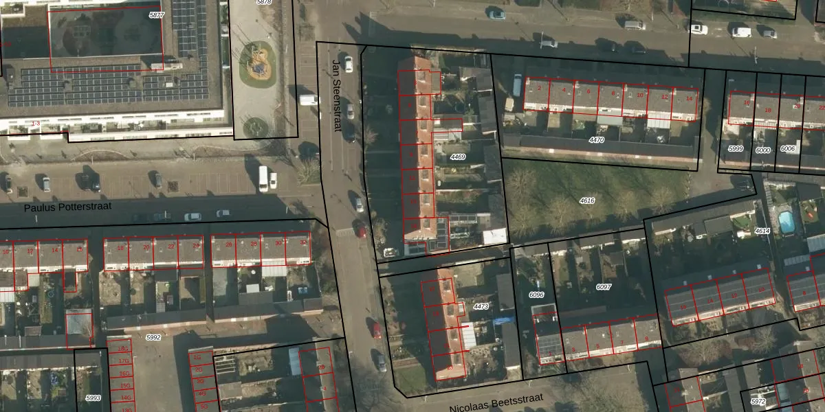 Het perceel waarop Jan Steenstraat 13 staat heeft een oppervlakte van 1630 m². Dit is een zeer groot perceel. De perceeloppervlakte wordt geregistreerd door het Kadaster. Gedetailleerde informatie over de maten van dit perceel kunt u vinden in het rapport Kadastrale kaart met maatvoering van Jan Steenstraat 13.