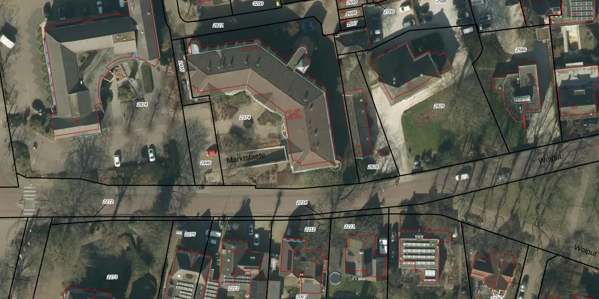Het perceel waarop Marktstaete 101-G staat heeft een oppervlakte van 2532 m². Dit is een zeer groot perceel. De perceeloppervlakte wordt geregistreerd door het Kadaster. Gedetailleerde informatie over de maten van dit perceel kunt u vinden in het rapport Kadastrale kaart met maatvoering van Marktstaete 101-G.