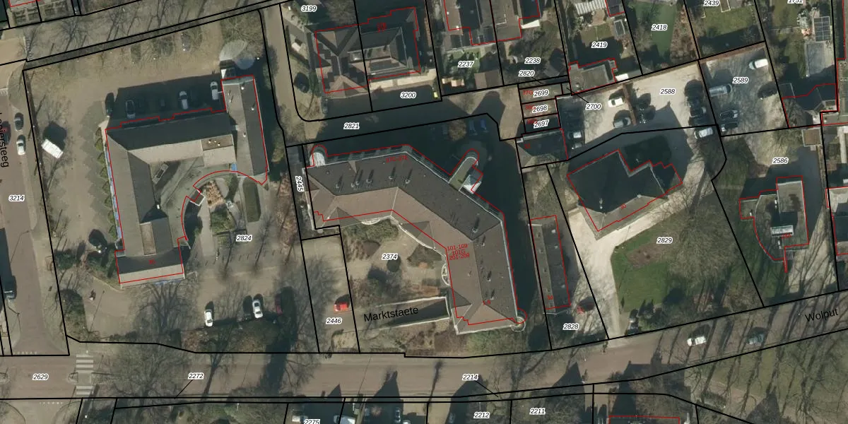 Het perceel waarop Marktstaete 105 staat heeft een oppervlakte van 2532 m². Dit is een zeer groot perceel. De perceeloppervlakte wordt geregistreerd door het Kadaster. Gedetailleerde informatie over de maten van dit perceel kunt u vinden in het rapport Kadastrale kaart met maatvoering van Marktstaete 105.