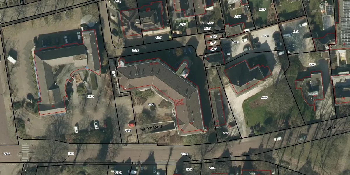 Het perceel waarop Marktstaete 206 staat heeft een oppervlakte van 2532 m². Dit is een zeer groot perceel. De perceeloppervlakte wordt geregistreerd door het Kadaster. Gedetailleerde informatie over de maten van dit perceel kunt u vinden in het rapport Kadastrale kaart met maatvoering van Marktstaete 206.