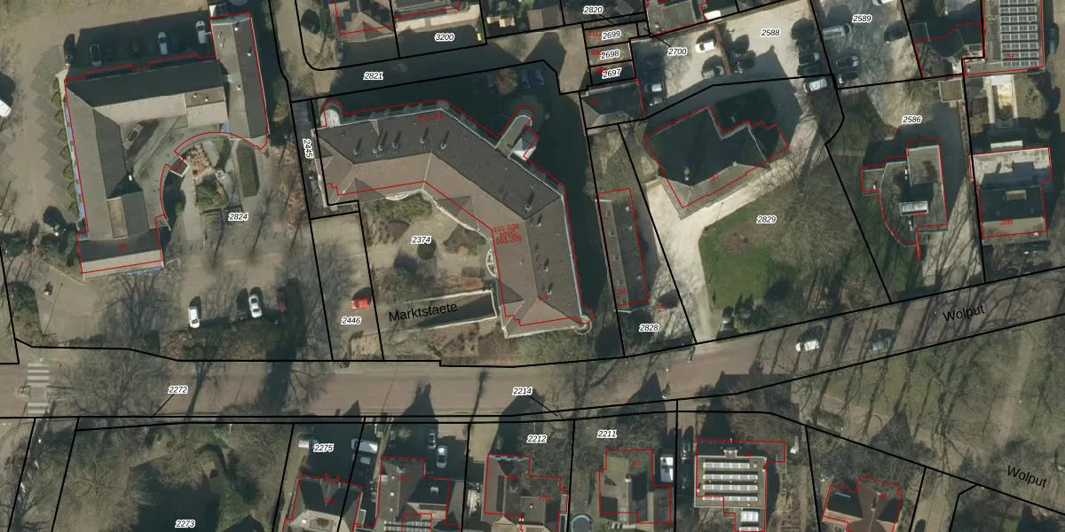 Het perceel waarop Marktstaete 209 staat heeft een oppervlakte van 2532 m². Dit is een zeer groot perceel. De perceeloppervlakte wordt geregistreerd door het Kadaster. Gedetailleerde informatie over de maten van dit perceel kunt u vinden in het rapport Kadastrale kaart met maatvoering van Marktstaete 209.