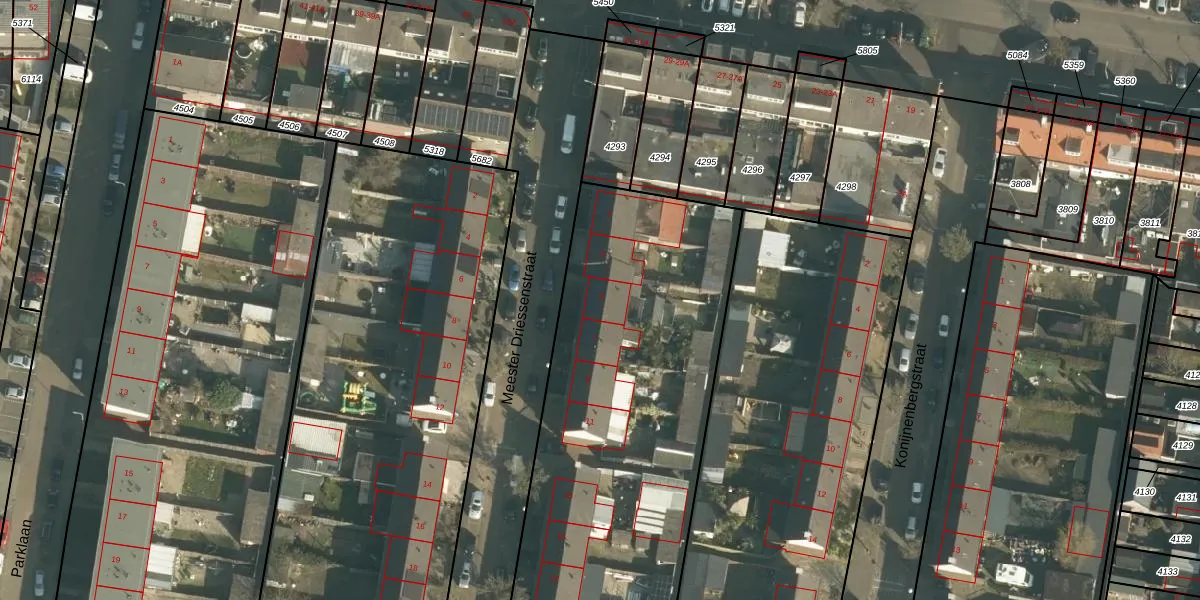 Het perceel waarop Meester Driessenstraat 5 staat heeft een oppervlakte van 4745 m². Dit is een zeer groot perceel. De perceeloppervlakte wordt geregistreerd door het Kadaster. Gedetailleerde informatie over de maten van dit perceel kunt u vinden in het rapport Kadastrale kaart met maatvoering van Meester Driessenstraat 5.