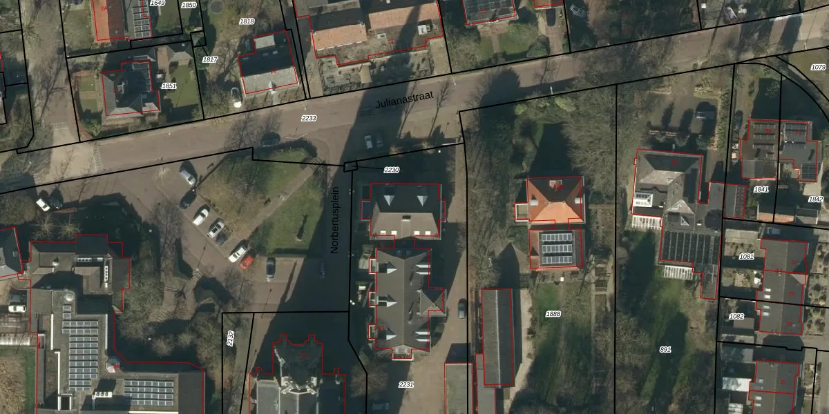 Het perceel waarop Norbertusplein 10 staat heeft een oppervlakte van 2175 m². Dit is een zeer groot perceel. De perceeloppervlakte wordt geregistreerd door het Kadaster. Gedetailleerde informatie over de maten van dit perceel kunt u vinden in het rapport Kadastrale kaart met maatvoering van Norbertusplein 10.