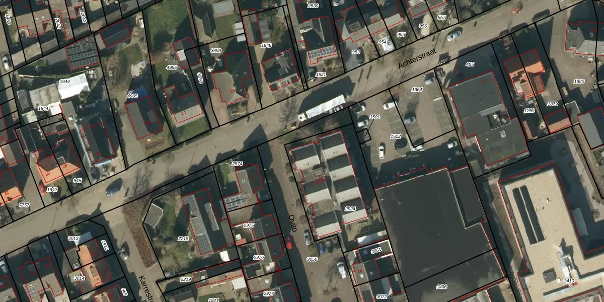 Het perceel waarop Ovito 1 staat heeft een oppervlakte van 900 m². Dit is een groot perceel. De perceeloppervlakte wordt geregistreerd door het Kadaster. Gedetailleerde informatie over de maten van dit perceel kunt u vinden in het rapport Kadastrale kaart met maatvoering van Ovito 1.