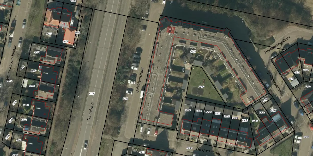 Het perceel waarop Schildersstraat 213 staat heeft een oppervlakte van 3303 m². Dit is een zeer groot perceel. De perceeloppervlakte wordt geregistreerd door het Kadaster. Gedetailleerde informatie over de maten van dit perceel kunt u vinden in het rapport Kadastrale kaart met maatvoering van Schildersstraat 213.