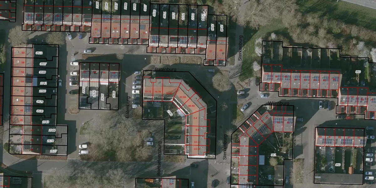 Het perceel waarop Batenburg 84 staat heeft een oppervlakte van 1429 m². Dit is een zeer groot perceel. De perceeloppervlakte wordt geregistreerd door het Kadaster. Gedetailleerde informatie over de maten van dit perceel kunt u vinden in het rapport Kadastrale kaart met maatvoering van Batenburg 84.