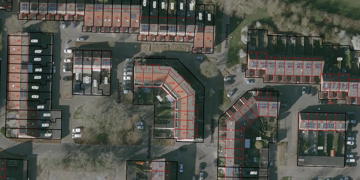 Het perceel waarop Batenburg 88 staat heeft een oppervlakte van 1429 m². Dit is een zeer groot perceel. De perceeloppervlakte wordt geregistreerd door het Kadaster. Gedetailleerde informatie over de maten van dit perceel kunt u vinden in het rapport Kadastrale kaart met maatvoering van Batenburg 88.
