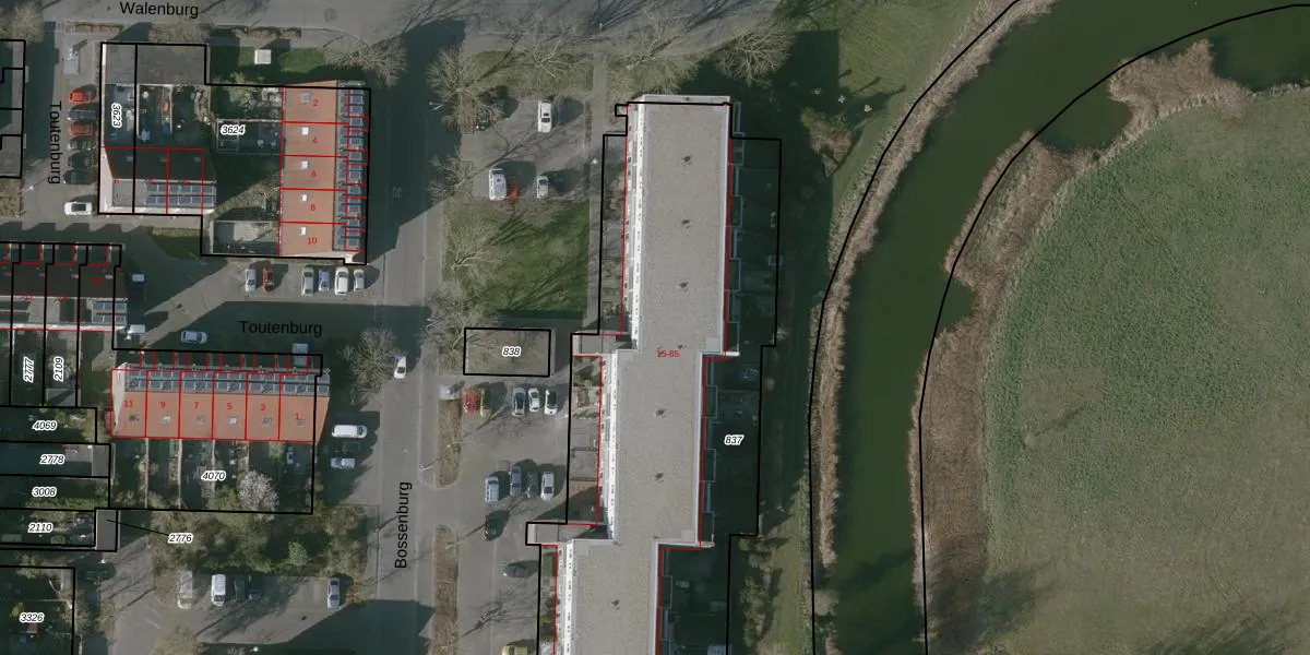 Het perceel waarop Bossenburg 59 staat heeft een oppervlakte van 2635 m². Dit is een zeer groot perceel. De perceeloppervlakte wordt geregistreerd door het Kadaster. Gedetailleerde informatie over de maten van dit perceel kunt u vinden in het rapport Kadastrale kaart met maatvoering van Bossenburg 59.