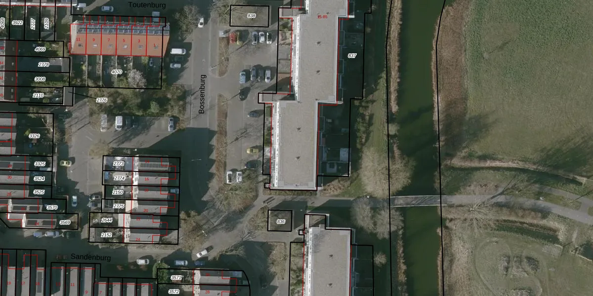 Het perceel waarop Bossenburg 81 staat heeft een oppervlakte van 2635 m². Dit is een zeer groot perceel. De perceeloppervlakte wordt geregistreerd door het Kadaster. Gedetailleerde informatie over de maten van dit perceel kunt u vinden in het rapport Kadastrale kaart met maatvoering van Bossenburg 81.