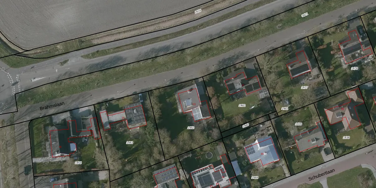 Het perceel waarop Brahmslaan 13 staat heeft een oppervlakte van 1130 m². Dit is een zeer groot perceel. De perceeloppervlakte wordt geregistreerd door het Kadaster. Gedetailleerde informatie over de maten van dit perceel kunt u vinden in het rapport Kadastrale kaart met maatvoering van Brahmslaan 13.