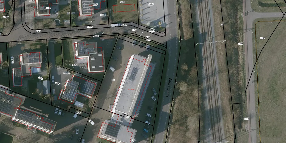 Het perceel waarop Edisonweg 53-d staat heeft een oppervlakte van 2020 m². Dit is een zeer groot perceel. De perceeloppervlakte wordt geregistreerd door het Kadaster. Gedetailleerde informatie over de maten van dit perceel kunt u vinden in het rapport Kadastrale kaart met maatvoering van Edisonweg 53-d.