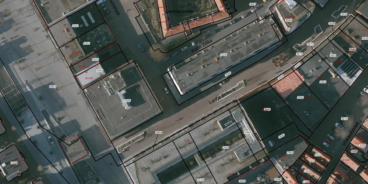 Lange Zelke 21 is gelegen op kadastraal perceel VSG00E2505. Deze kadastrale aanduiding is uniek en wordt gebruikt door het Kadaster om eigendomsrechten en andere zakelijke rechten vast te leggen. Het perceel maakt onderdeel uit van de kadastrale gemeente Vlissingen.