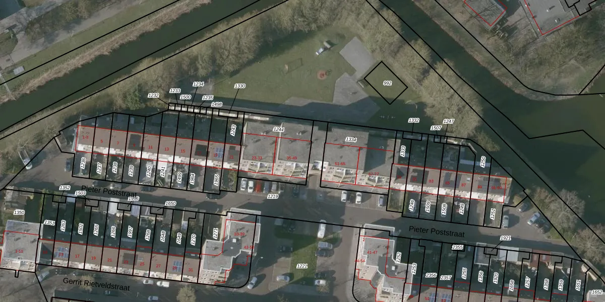 Het perceel waarop Pieter Poststraat 49 staat heeft een oppervlakte van 501 m². Dit is een groot perceel. De perceeloppervlakte wordt geregistreerd door het Kadaster. Gedetailleerde informatie over de maten van dit perceel kunt u vinden in het rapport Kadastrale kaart met maatvoering van Pieter Poststraat 49.