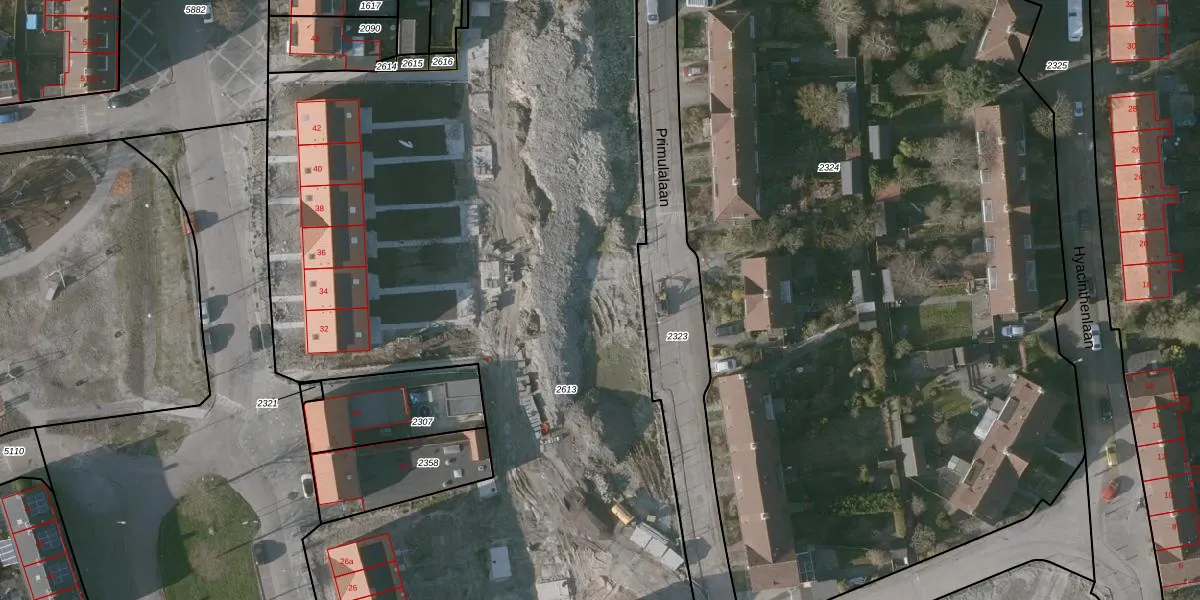 Het perceel waarop Primulalaan 15 staat heeft een oppervlakte van 6686 m². Dit is een zeer groot perceel. De perceeloppervlakte wordt geregistreerd door het Kadaster. Gedetailleerde informatie over de maten van dit perceel kunt u vinden in het rapport Kadastrale kaart met maatvoering van Primulalaan 15.