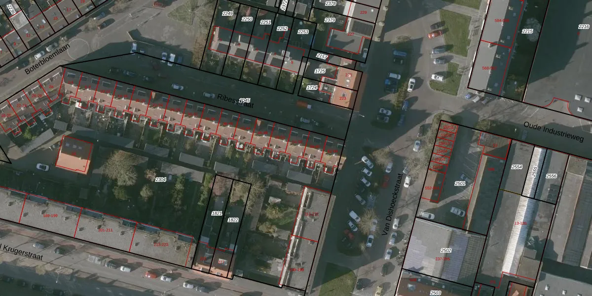 Ribesstraat 54 is gelegen op kadastraal perceel VSG00B2304. Deze kadastrale aanduiding is uniek en wordt gebruikt door het Kadaster om eigendomsrechten en andere zakelijke rechten vast te leggen. Het perceel maakt onderdeel uit van de kadastrale gemeente Vlissingen.