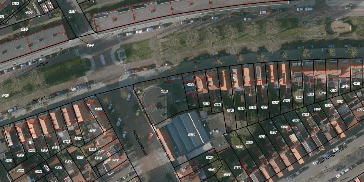 Het perceel waarop Singel 196 staat heeft een oppervlakte van 559 m². Dit is een groot perceel. De perceeloppervlakte wordt geregistreerd door het Kadaster. Gedetailleerde informatie over de maten van dit perceel kunt u vinden in het rapport Kadastrale kaart met maatvoering van Singel 196.