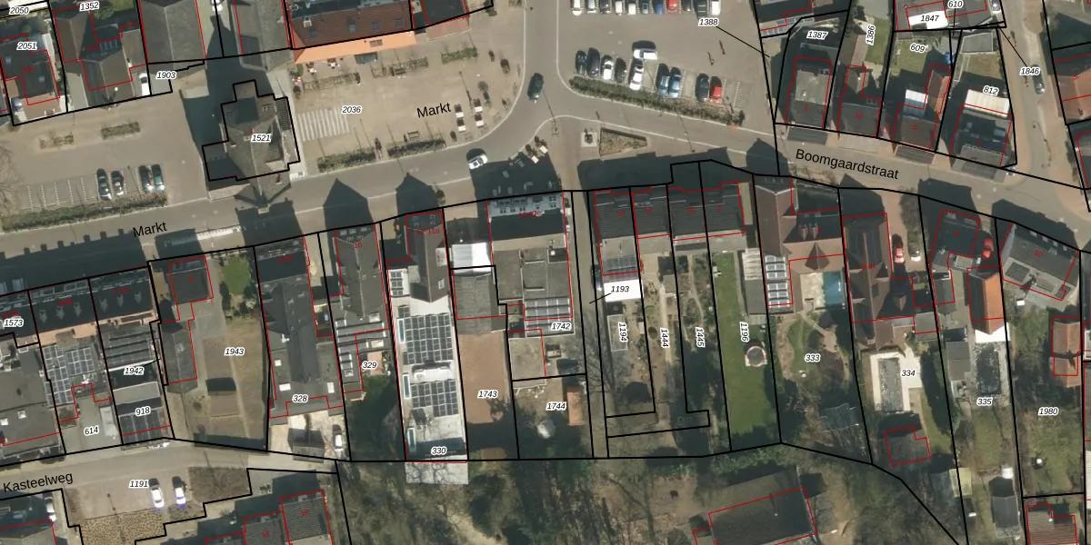 Het perceel waarop Markt 12-b staat heeft een oppervlakte van 593 m². Dit is een groot perceel. De perceeloppervlakte wordt geregistreerd door het Kadaster. Gedetailleerde informatie over de maten van dit perceel kunt u vinden in het rapport Kadastrale kaart met maatvoering van Markt 12-b.