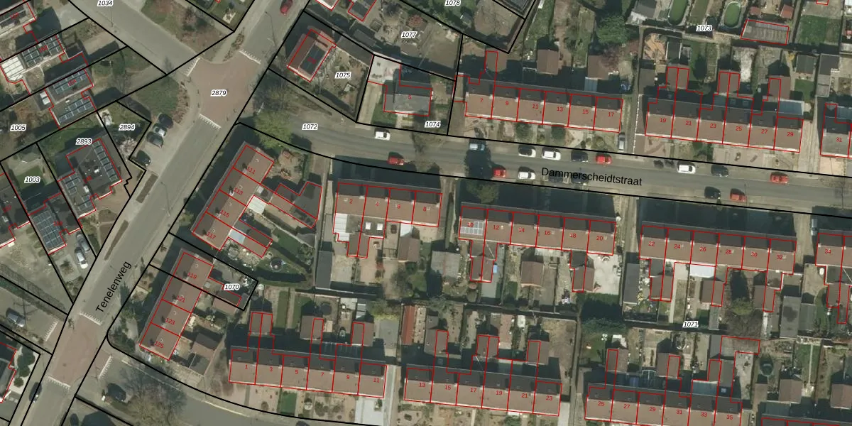 Het perceel waarop Dammerscheidtstraat 8 staat heeft een oppervlakte van 1,2 ha. Dit is een zeer groot perceel. De perceeloppervlakte wordt geregistreerd door het Kadaster. Gedetailleerde informatie over de maten van dit perceel kunt u vinden in het rapport Kadastrale kaart met maatvoering van Dammerscheidtstraat 8.