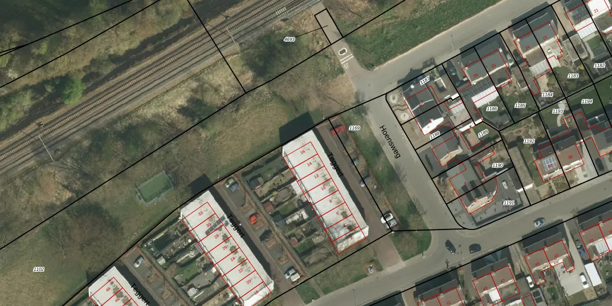 Het perceel waarop Teggert 16 staat heeft een oppervlakte van 9765 m². Dit is een zeer groot perceel. De perceeloppervlakte wordt geregistreerd door het Kadaster. Gedetailleerde informatie over de maten van dit perceel kunt u vinden in het rapport Kadastrale kaart met maatvoering van Teggert 16.