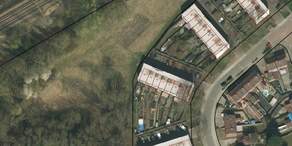 Het perceel waarop Teggert 80 staat heeft een oppervlakte van 9765 m². Dit is een zeer groot perceel. De perceeloppervlakte wordt geregistreerd door het Kadaster. Gedetailleerde informatie over de maten van dit perceel kunt u vinden in het rapport Kadastrale kaart met maatvoering van Teggert 80.