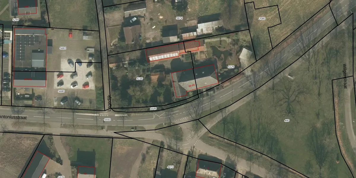 Het perceel waarop Antoniusstraat 66 staat heeft een oppervlakte van 1503 m². Dit is een zeer groot perceel. De perceeloppervlakte wordt geregistreerd door het Kadaster. Gedetailleerde informatie over de maten van dit perceel kunt u vinden in het rapport Kadastrale kaart met maatvoering van Antoniusstraat 66.