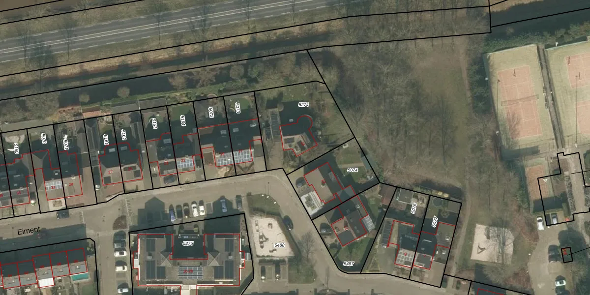 Het perceel waarop Eiment 15 staat heeft een oppervlakte van 728 m². Dit is een groot perceel. De perceeloppervlakte wordt geregistreerd door het Kadaster. Gedetailleerde informatie over de maten van dit perceel kunt u vinden in het rapport Kadastrale kaart met maatvoering van Eiment 15.