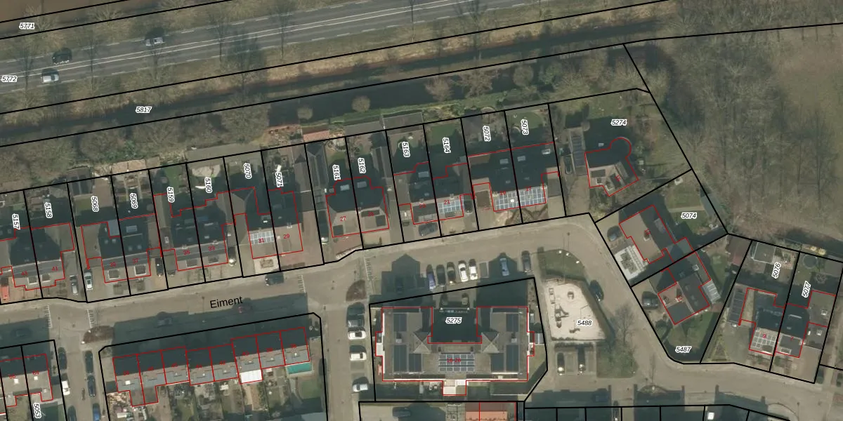 Het perceel waarop Eiment 23 staat heeft een oppervlakte van 245 m². Dit is een middelgroot perceel. De perceeloppervlakte wordt geregistreerd door het Kadaster. Gedetailleerde informatie over de maten van dit perceel kunt u vinden in het rapport Kadastrale kaart met maatvoering van Eiment 23.