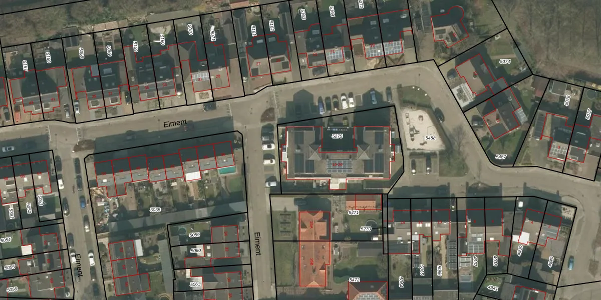 Het perceel waarop Eiment 26 staat heeft een oppervlakte van 1052 m². Dit is een zeer groot perceel. De perceeloppervlakte wordt geregistreerd door het Kadaster. Gedetailleerde informatie over de maten van dit perceel kunt u vinden in het rapport Kadastrale kaart met maatvoering van Eiment 26.