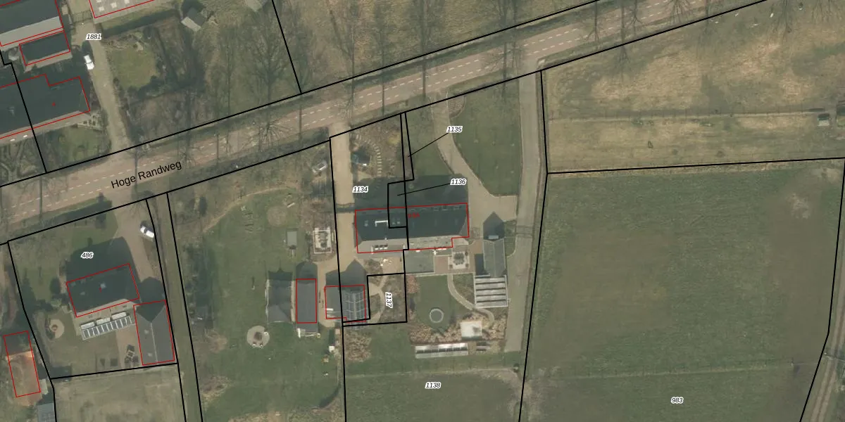 Het perceel waarop Hoge Randweg 9-A staat heeft een oppervlakte van 5937 m². Dit is een zeer groot perceel. De perceeloppervlakte wordt geregistreerd door het Kadaster. Gedetailleerde informatie over de maten van dit perceel kunt u vinden in het rapport Kadastrale kaart met maatvoering van Hoge Randweg 9-A.