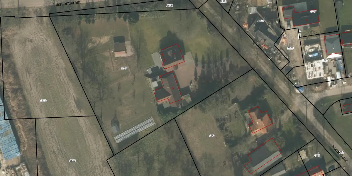 Het perceel waarop Kortestraat 1-A staat heeft een oppervlakte van 5480 m². Dit is een zeer groot perceel. De perceeloppervlakte wordt geregistreerd door het Kadaster. Gedetailleerde informatie over de maten van dit perceel kunt u vinden in het rapport Kadastrale kaart met maatvoering van Kortestraat 1-A.
