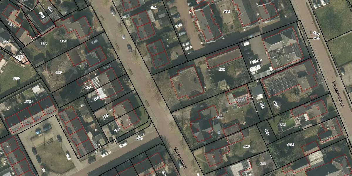 Het perceel waarop Marterstraat 14 staat heeft een oppervlakte van 1215 m². Dit is een zeer groot perceel. De perceeloppervlakte wordt geregistreerd door het Kadaster. Gedetailleerde informatie over de maten van dit perceel kunt u vinden in het rapport Kadastrale kaart met maatvoering van Marterstraat 14.