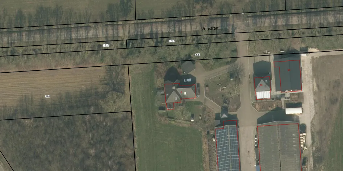 Het perceel waarop Venstraat 3 staat heeft een oppervlakte van 5,0 ha. Dit is een zeer groot perceel. De perceeloppervlakte wordt geregistreerd door het Kadaster. Gedetailleerde informatie over de maten van dit perceel kunt u vinden in het rapport Kadastrale kaart met maatvoering van Venstraat 3.