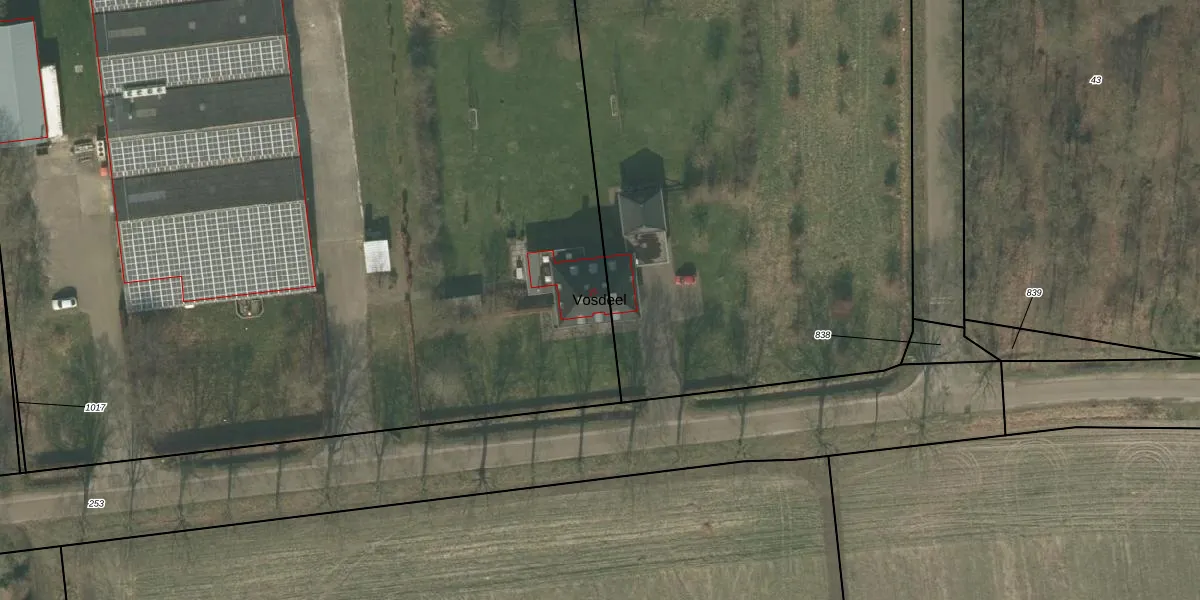 Het perceel waarop Vosdeel 15 staat heeft een oppervlakte van 1,0 ha. Dit is een zeer groot perceel. De perceeloppervlakte wordt geregistreerd door het Kadaster. Gedetailleerde informatie over de maten van dit perceel kunt u vinden in het rapport Kadastrale kaart met maatvoering van Vosdeel 15.