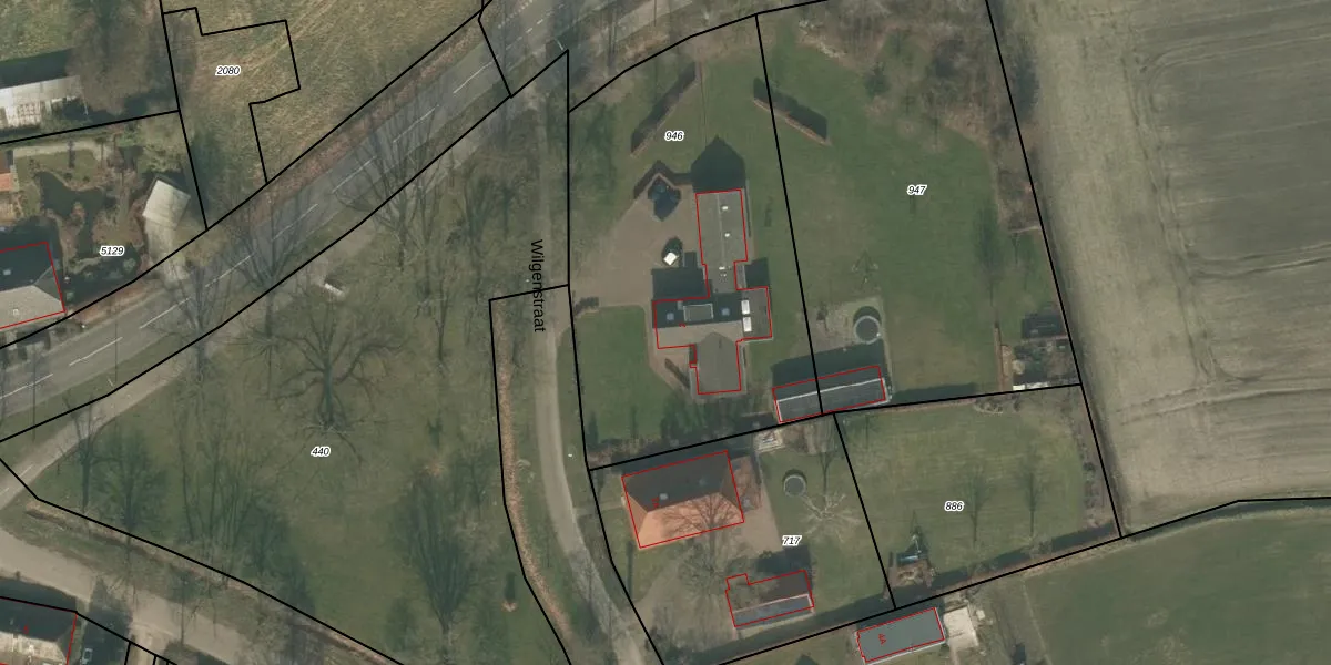 Het perceel waarop Wilgenstraat 2 staat heeft een oppervlakte van 1960 m². Dit is een zeer groot perceel. De perceeloppervlakte wordt geregistreerd door het Kadaster. Gedetailleerde informatie over de maten van dit perceel kunt u vinden in het rapport Kadastrale kaart met maatvoering van Wilgenstraat 2.