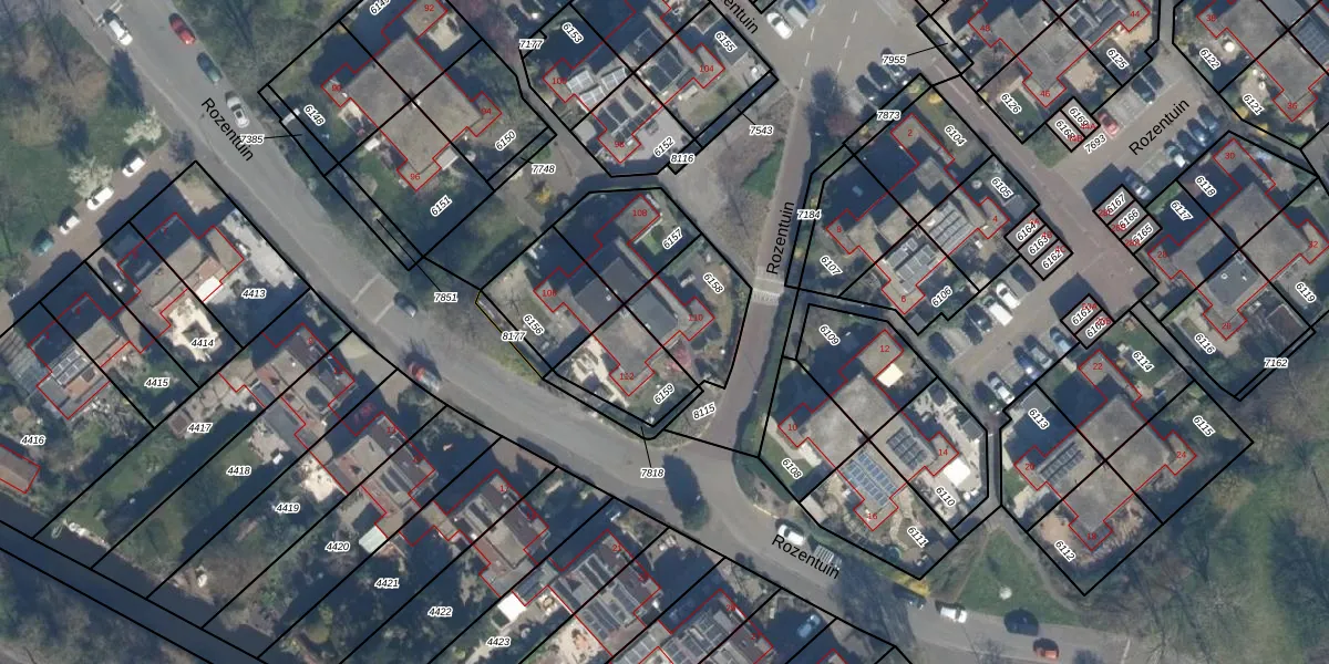 Rozentuin 110 is gelegen op kadastraal perceel VBG01D6158. Deze kadastrale aanduiding is uniek en wordt gebruikt door het Kadaster om eigendomsrechten en andere zakelijke rechten vast te leggen. Het perceel maakt onderdeel uit van de kadastrale gemeente Voorburg.