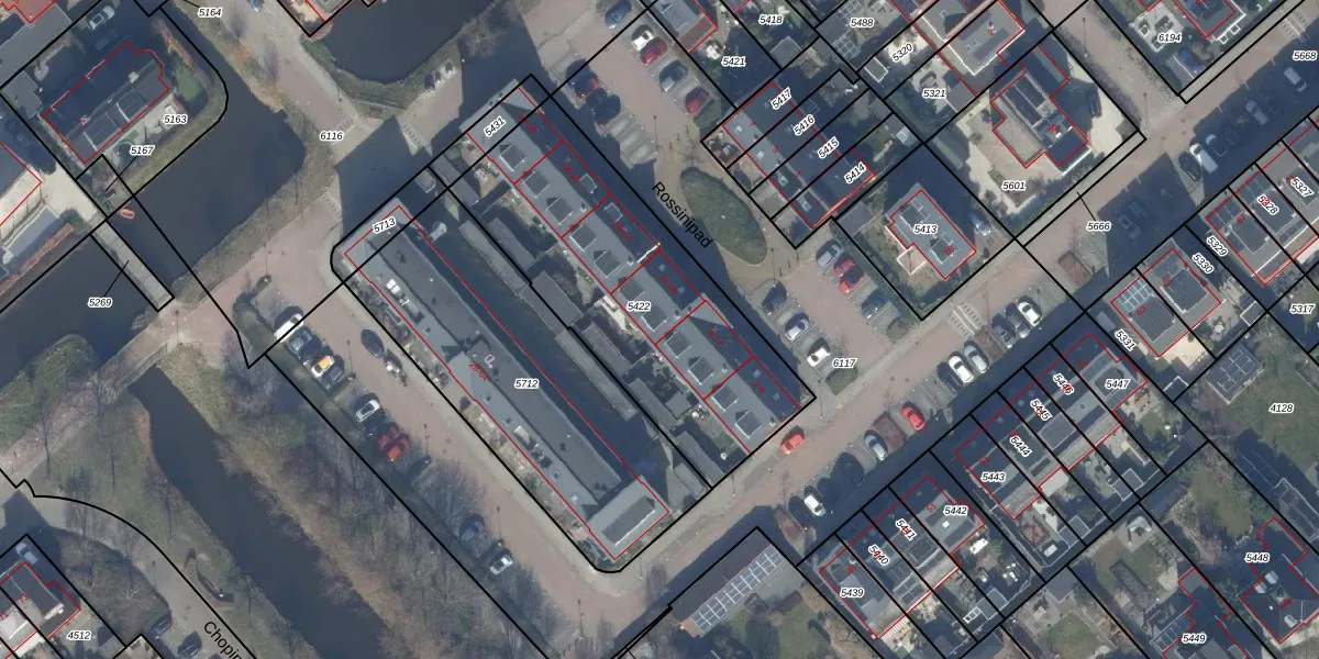 Het perceel waarop Rossinipad 16 staat heeft een oppervlakte van 1275 m². Dit is een zeer groot perceel. De perceeloppervlakte wordt geregistreerd door het Kadaster. Gedetailleerde informatie over de maten van dit perceel kunt u vinden in het rapport Kadastrale kaart met maatvoering van Rossinipad 16.