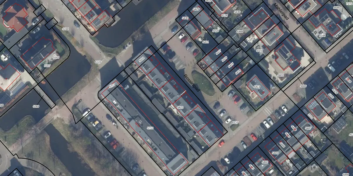 Het perceel waarop Rossinipad 20 staat heeft een oppervlakte van 1275 m². Dit is een zeer groot perceel. De perceeloppervlakte wordt geregistreerd door het Kadaster. Gedetailleerde informatie over de maten van dit perceel kunt u vinden in het rapport Kadastrale kaart met maatvoering van Rossinipad 20.