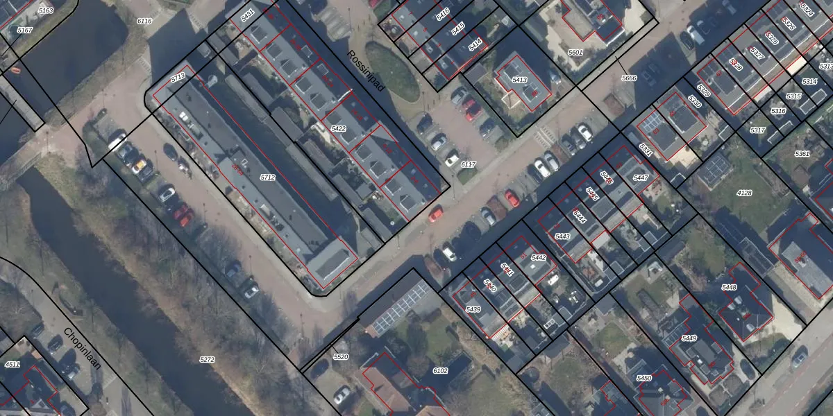 Het perceel waarop Rossinipad 4 staat heeft een oppervlakte van 1275 m². Dit is een zeer groot perceel. De perceeloppervlakte wordt geregistreerd door het Kadaster. Gedetailleerde informatie over de maten van dit perceel kunt u vinden in het rapport Kadastrale kaart met maatvoering van Rossinipad 4.