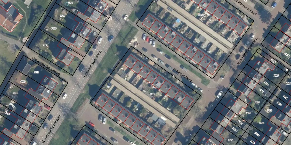Het perceel waarop Dourleindreef 13 staat heeft een oppervlakte van 2879 m². Dit is een zeer groot perceel. De perceeloppervlakte wordt geregistreerd door het Kadaster. Gedetailleerde informatie over de maten van dit perceel kunt u vinden in het rapport Kadastrale kaart met maatvoering van Dourleindreef 13.