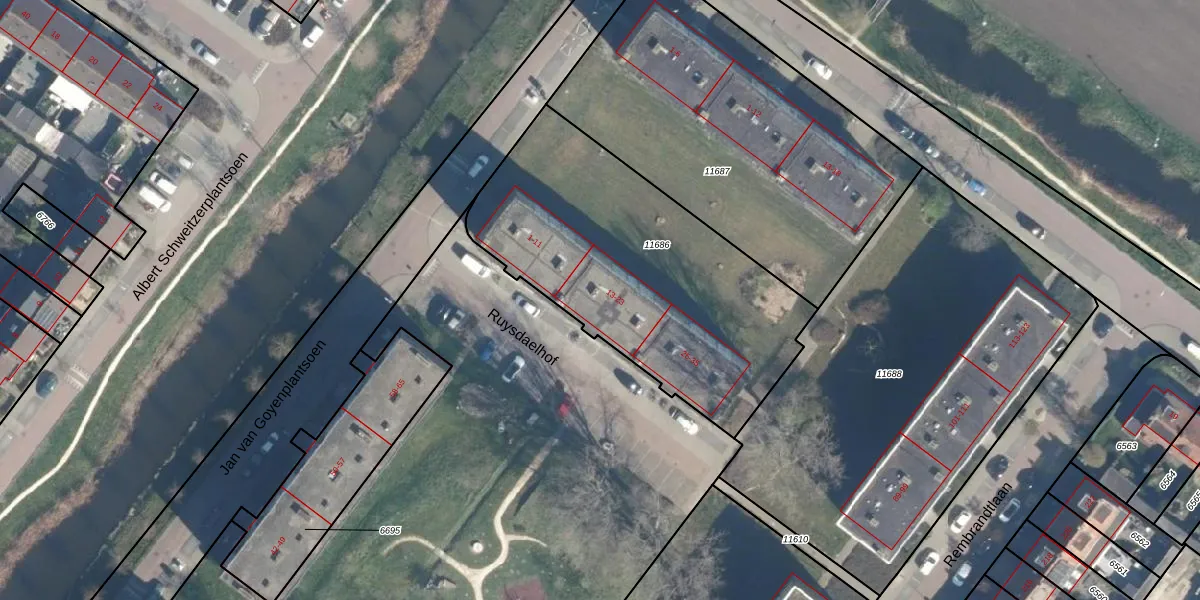 Het perceel waarop Ruysdaelhof 21 staat heeft een oppervlakte van 1480 m². Dit is een zeer groot perceel. De perceeloppervlakte wordt geregistreerd door het Kadaster. Gedetailleerde informatie over de maten van dit perceel kunt u vinden in het rapport Kadastrale kaart met maatvoering van Ruysdaelhof 21.