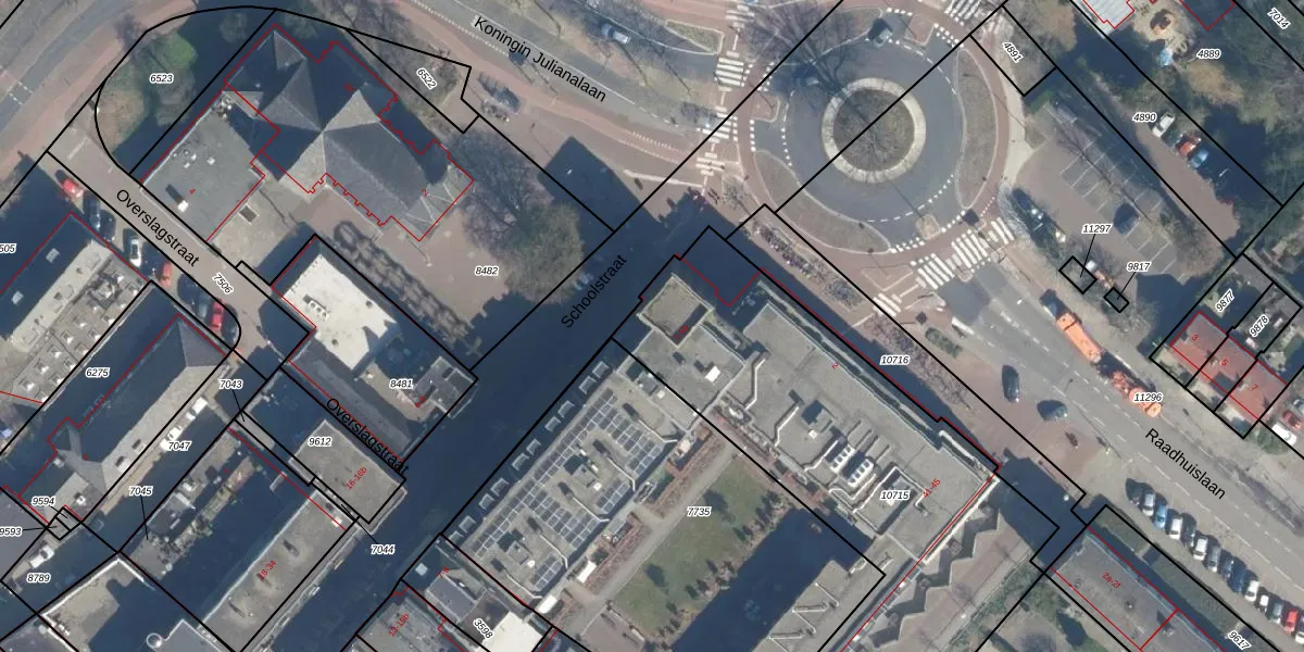 Het perceel waarop Schoolstraat 1-j staat heeft een oppervlakte van 2338 m². Dit is een zeer groot perceel. De perceeloppervlakte wordt geregistreerd door het Kadaster. Gedetailleerde informatie over de maten van dit perceel kunt u vinden in het rapport Kadastrale kaart met maatvoering van Schoolstraat 1-j.