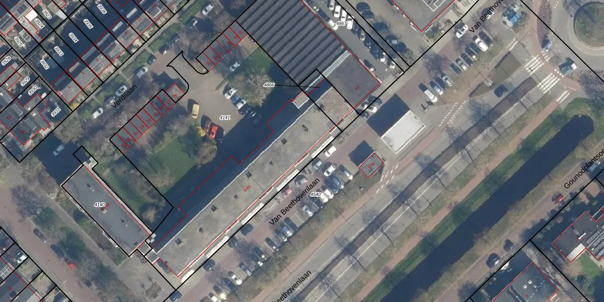 Het perceel waarop Van Beethovenlaan 25 staat heeft een oppervlakte van 3242 m². Dit is een zeer groot perceel. De perceeloppervlakte wordt geregistreerd door het Kadaster. Gedetailleerde informatie over de maten van dit perceel kunt u vinden in het rapport Kadastrale kaart met maatvoering van Van Beethovenlaan 25.