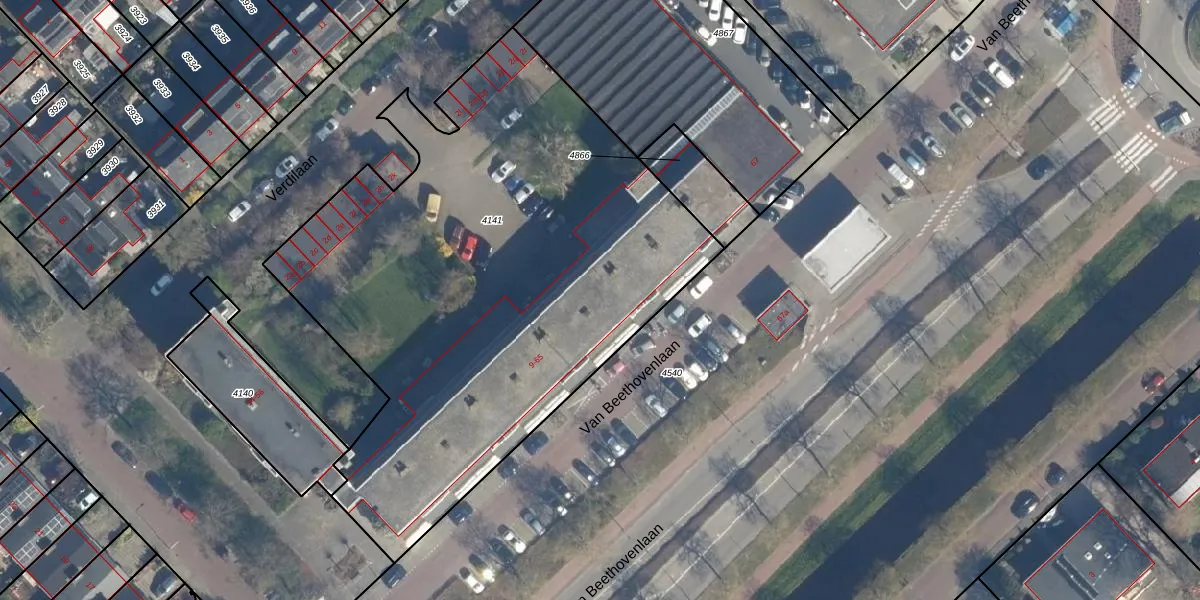 Het perceel waarop Van Beethovenlaan 39 staat heeft een oppervlakte van 3242 m². Dit is een zeer groot perceel. De perceeloppervlakte wordt geregistreerd door het Kadaster. Gedetailleerde informatie over de maten van dit perceel kunt u vinden in het rapport Kadastrale kaart met maatvoering van Van Beethovenlaan 39.