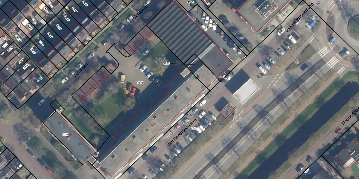 Het perceel waarop Van Beethovenlaan 59 staat heeft een oppervlakte van 3242 m². Dit is een zeer groot perceel. De perceeloppervlakte wordt geregistreerd door het Kadaster. Gedetailleerde informatie over de maten van dit perceel kunt u vinden in het rapport Kadastrale kaart met maatvoering van Van Beethovenlaan 59.
