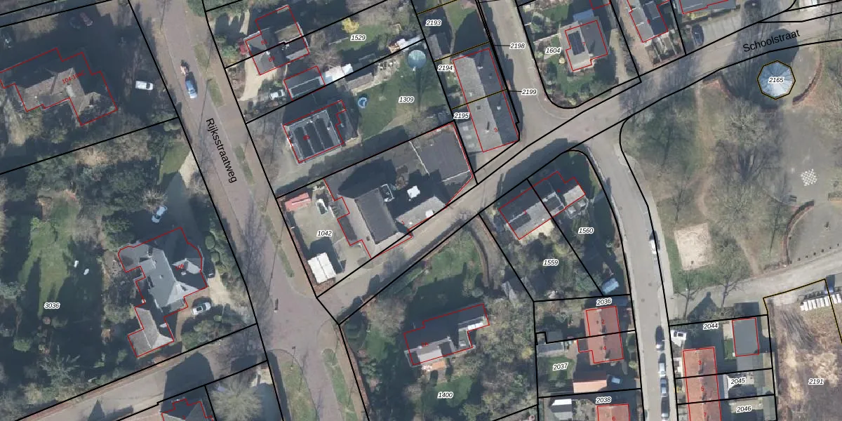 Schoolstraat 1-B is gelegen op kadastraal perceel VOO00D1042. Deze kadastrale aanduiding is uniek en wordt gebruikt door het Kadaster om eigendomsrechten en andere zakelijke rechten vast te leggen. Het perceel maakt onderdeel uit van de kadastrale gemeente Voorst.