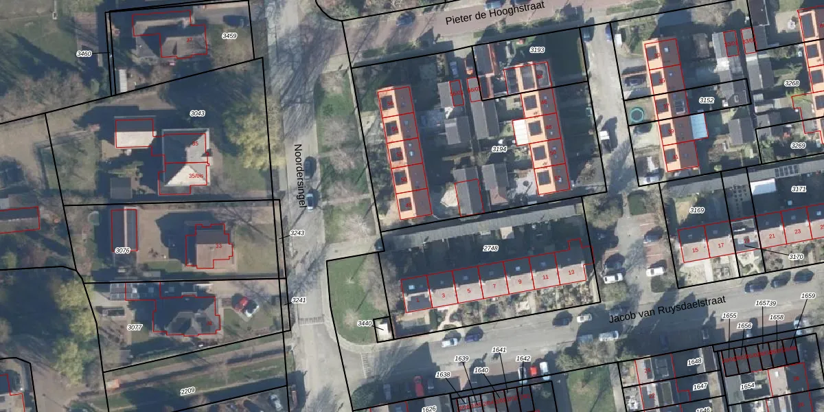 Het perceel waarop Noordersingel 48 staat heeft een oppervlakte van 1911 m². Dit is een zeer groot perceel. De perceeloppervlakte wordt geregistreerd door het Kadaster. Gedetailleerde informatie over de maten van dit perceel kunt u vinden in het rapport Kadastrale kaart met maatvoering van Noordersingel 48.