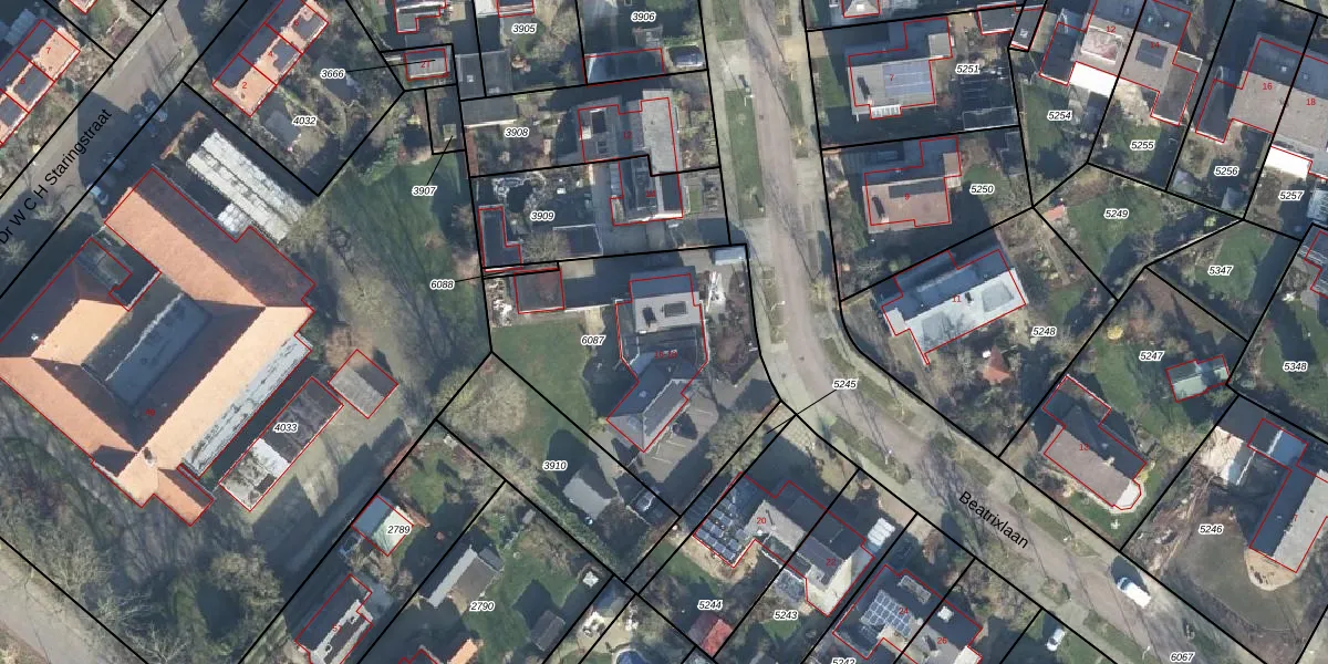 Beatrixlaan 16 is gelegen op kadastraal perceel VDN02K6087. Deze kadastrale aanduiding is uniek en wordt gebruikt door het Kadaster om eigendomsrechten en andere zakelijke rechten vast te leggen. Het perceel maakt onderdeel uit van de kadastrale gemeente Vorden.