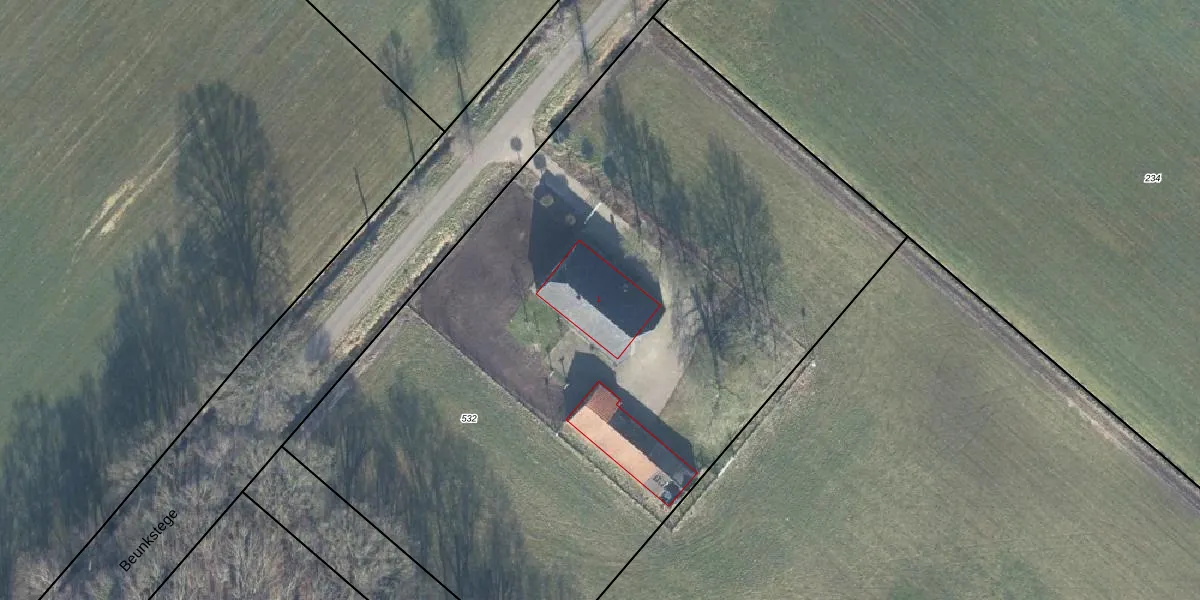 Het perceel waarop Beunkstege 1 staat heeft een oppervlakte van 5330 m². Dit is een zeer groot perceel. De perceeloppervlakte wordt geregistreerd door het Kadaster. Gedetailleerde informatie over de maten van dit perceel kunt u vinden in het rapport Kadastrale kaart met maatvoering van Beunkstege 1.