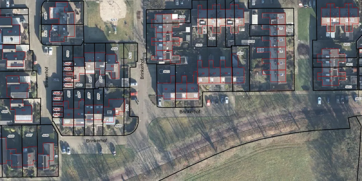 Het perceel waarop Brinkerhof 61 staat heeft een oppervlakte van 1740 m². Dit is een zeer groot perceel. De perceeloppervlakte wordt geregistreerd door het Kadaster. Gedetailleerde informatie over de maten van dit perceel kunt u vinden in het rapport Kadastrale kaart met maatvoering van Brinkerhof 61.